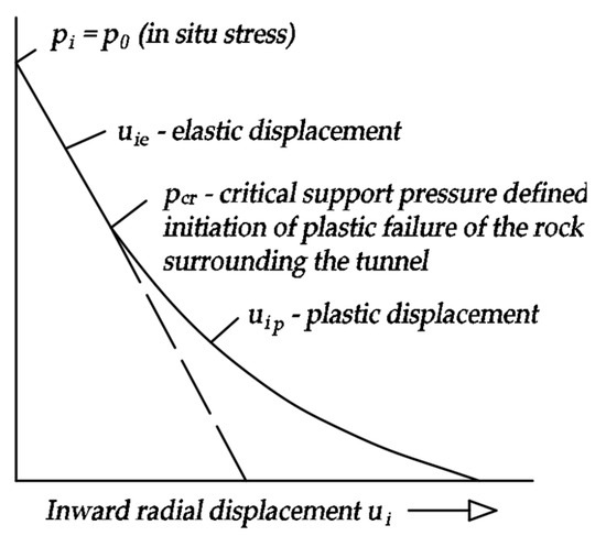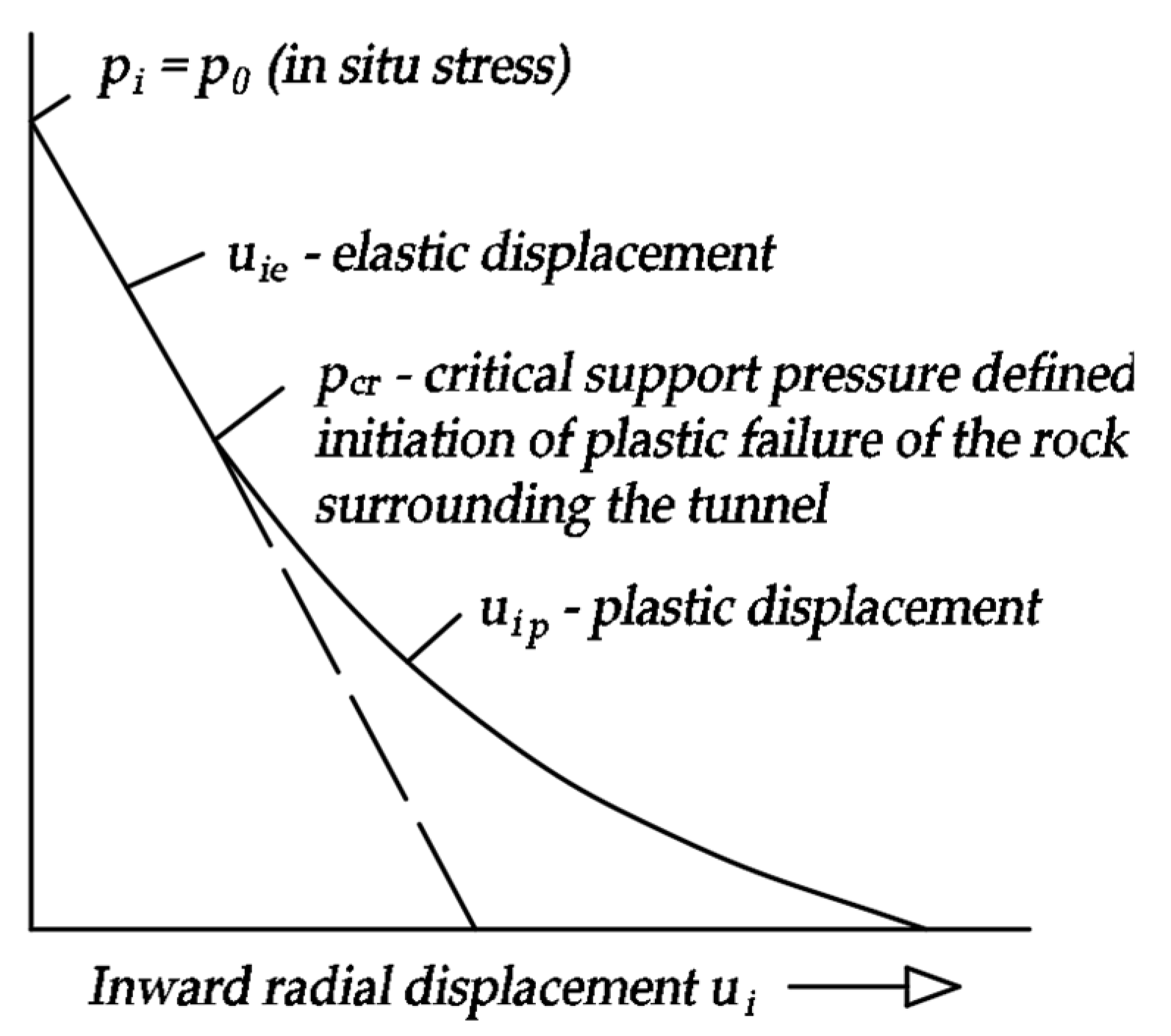 The load acting on the tunnel lining was determined using the ground reaction curve method with the Hoek–Brown failure criterion, which is commonly applied to tunnels excavated in rock masses with varying degrees of fracturing. It is assumed that the rock mass response is elastic–plastic–brittle, accompanied by an increase in volume due to plastic deformation. The stress–strain response is considered elastic until the peak strength is reached, after which an immediate drop to the residual strength is observed (Figure 3).