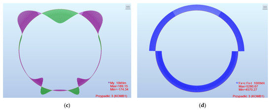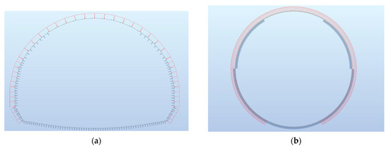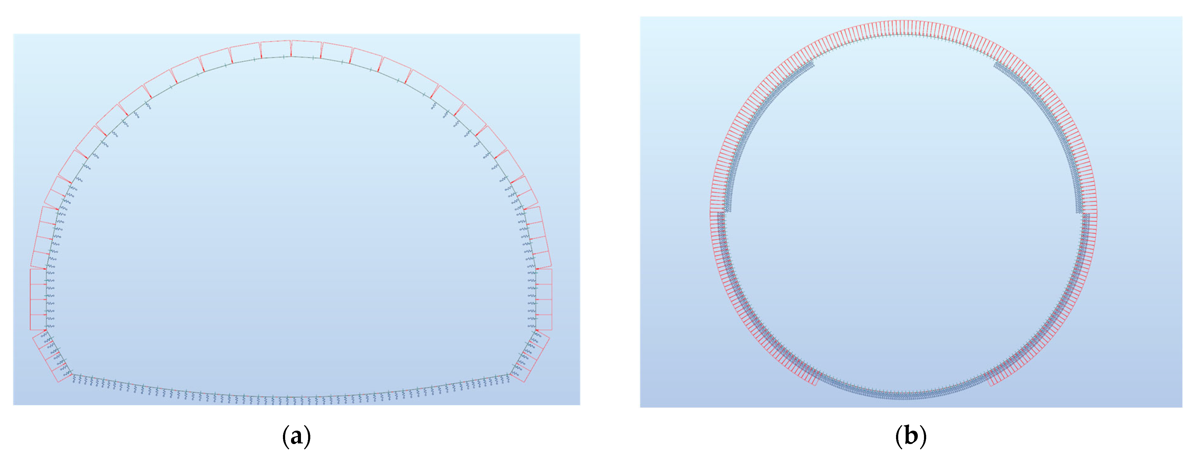 Figure 4b illustrates the loading scheme of the final lining in the TBM method. In this case, the load is more uniformly distributed along the entire perimeter of the cross-section and corresponds to a situation in which the segmental lining is installed immediately after excavation. Under these conditions, the development of rock mass deformations is significantly limited, resulting in a larger portion of the ground pressure being directly transferred to the lining.