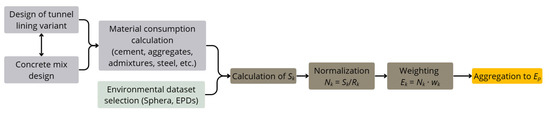This approach yields a single aggregated environmental impact indicator value Ep, representing a dimensionless measure of the total impact of the analyzed variant (in this study—the tunnel lining over its entire analyzed length). This value constitutes the main outcome of the assessment, allowing for comparison among all variants.