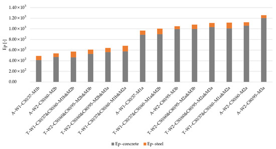 In the case of the TBM technology, the use of higher-strength concrete resulted in a reduction in the total environmental impact (Ep). Unlike in the ADECO–RS method, increasing the concrete class in this case was associated with a substantial decrease in the quantities of construction materials—both the concrete volume (17.17%) and the reinforcement mass (26.82%)—which translated into a lower Ep value. The variants with higher concrete classes T–W2–C50/60&C80/95–M2b&M3b and T–W2–C50/60&C80/95–M2b&M3a, achieved values of Ep that were comparable to (as in T–W1–C30/37&C50/60–M1b&M2b) or lower than those of the variants with lower concrete classes (e.g., T–W1–C30/37&C50/60–M1b&M2a).
