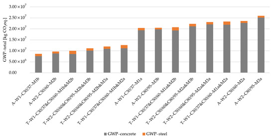 Similarly to the ADECO–RS technology, the (b) variants exhibited lower environmental impacts compared with the corresponding Portland-cement variants (a), e.g., (T–W1–C30/37&C50/60–M1a&M2a and T–W1–C30/37&C50/60–M1b&M2b).