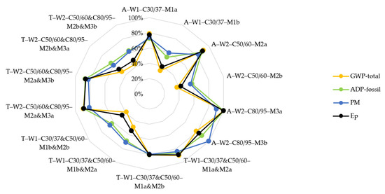 To more accurately assess the degree of consistency between the environmental categories, a comparison was performed for the three indicators with the largest contribution to the Ep value (a combined 79–80%): GWP–total, ADP–fossil, and PM. The values for each indicator were normalized within the range of 0–100% relative to the maximum value in the given category and presented in a radar chart (Figure 10), which made it possible to determine the relationships between the variant rankings. The results confirm that, despite the general consistency of trends, the individual impact categories do not exhibit full agreement, particularly in the case of ADP–fossil and PM. This highlights the need for multi-dimensional environmental assessments that include more than one impact category. Similar conclusions were also reported in the literature, e.g., in ref. [59], where it was emphasized that analyses should include not only GWP–total but also ADP–fossil.