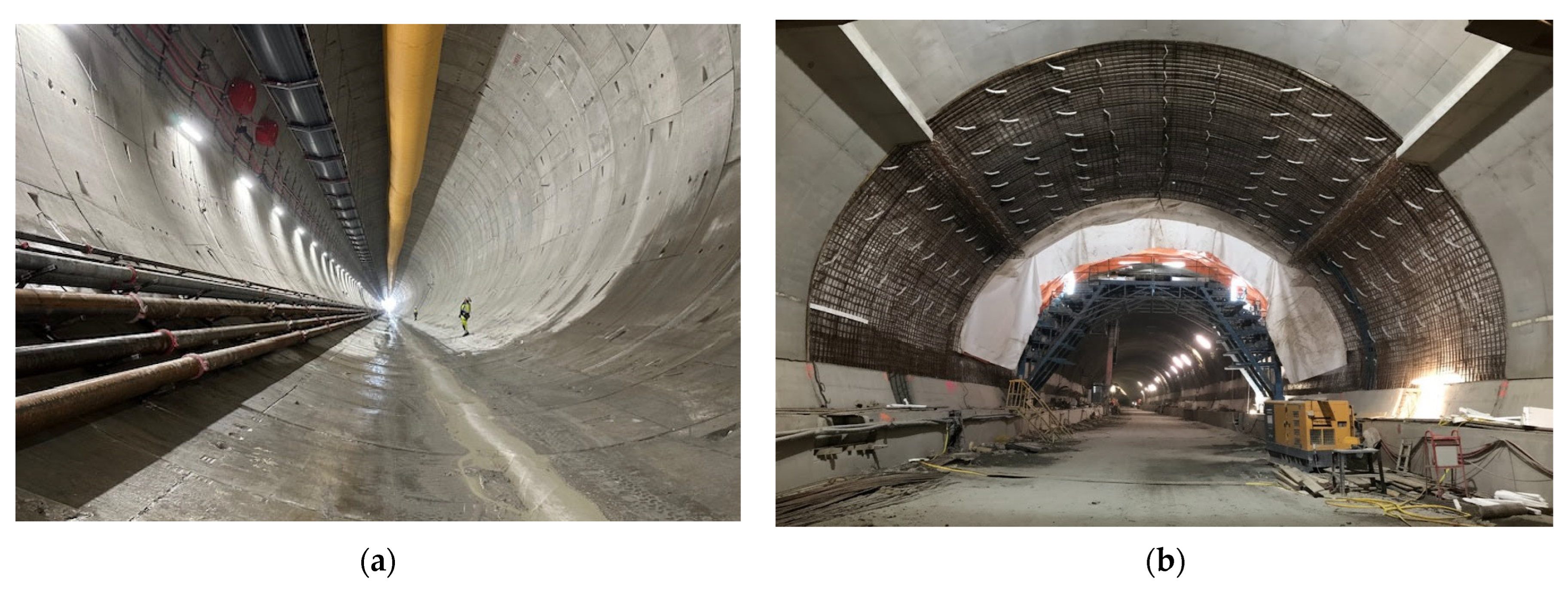 In engineering practice, various tunneling methods are employed, and their selection depends primarily on geological conditions, excavation depth, and the availability of specific technologies [5]. Commonly applied techniques include TBM (Tunnel Boring Machine) [6], NATM (New Austrian Tunnelling Method) [7], ADECO–RS (Analysis of Controlled Deformation in Rocks and Soils) [8], and the Cut-and-Cover method [9]. Among the available technologies, the TBM method is distinguished by a high degree of mechanization and automation of the excavation process. The TBM machine (Figure 2a) [10,11,12], in turn, contrasts with the ADECO–RS technique (Figure 2b), which relies on the controlled use of ground deformations to ensure excavation stability [13]. Despite their structural differences, both techniques are widely used in infrastructure projects and constitute an important component of modern underground construction.