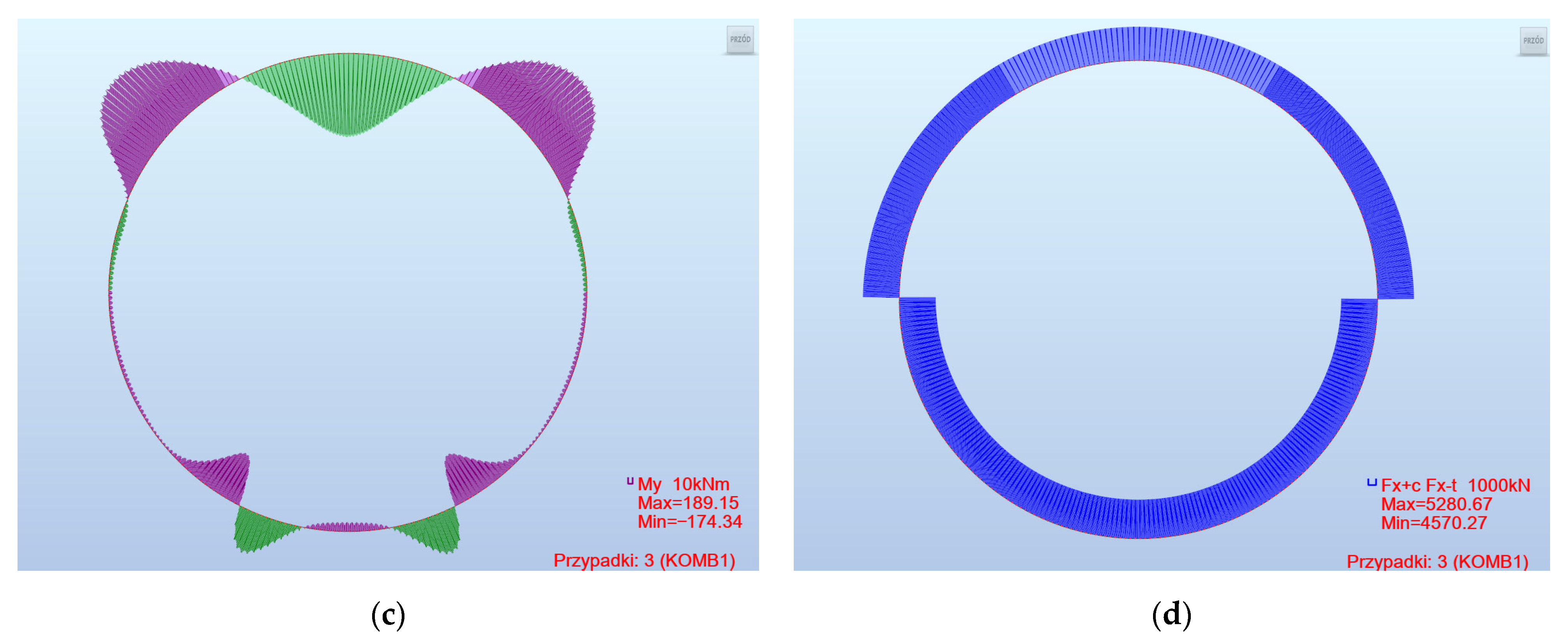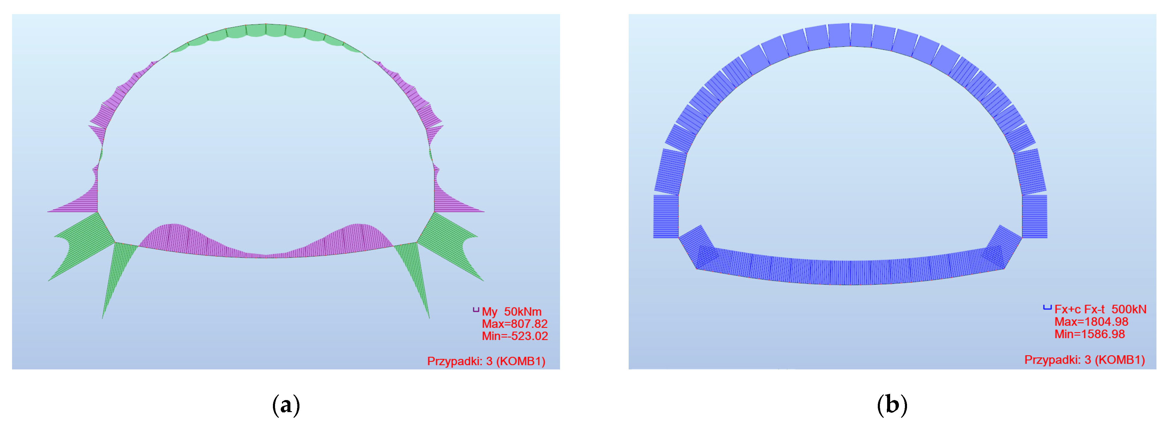 The calculations performed for all load cases made it possible to determine the maximum (positive and negative) values of internal forces in the respective elements. The design of the reinforced concrete sections of the tunnel linings was conducted in accordance with the requirements of Eurocode 2 (PN-EN 1992-1-1) [45]. The computations included an analysis of the interaction between axial forces and bending moments. Based on this analysis, the diameters and number of reinforcing bars were selected to ensure adequate load-bearing capacity and operational safety.