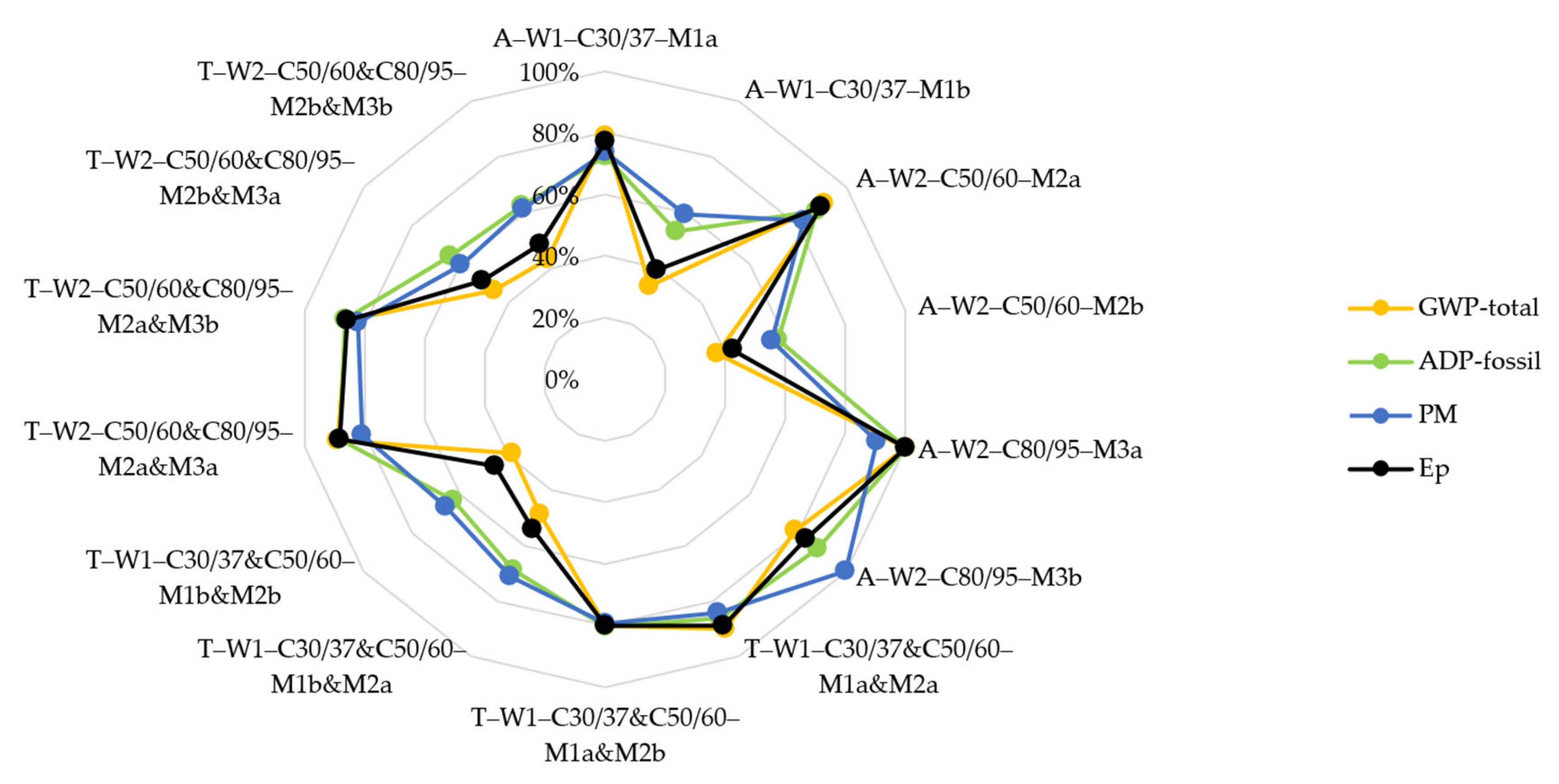 In the subsequent stage of the study, the influence of concrete mix composition on the potential to reduce environmental impacts was analyzed. For each concrete class, two variants were considered: