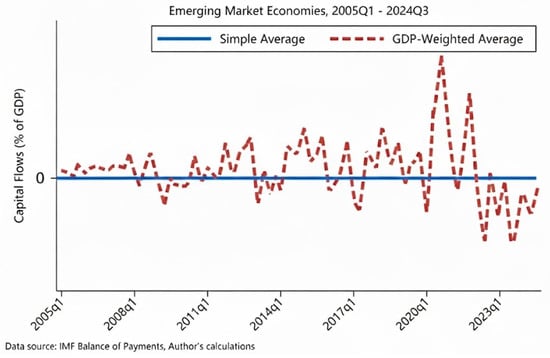 Figure 1 illustrates the dramatic boom–bust cycles in net capital inflows to our 19-EME sample over 2005Q1–2024Q3, with surges during Fed QE and sharp reversals during the 2013 taper tantrum and 2022–2023 tightening. The exceptional 2020–2022 spike reflects unprecedented Fed pandemic-era accommodation ($120 billion monthly asset purchases), while the 2023 decline followed the Fed’s rapid 525-basis-point tightening cycle. The sample comprises 19 EMEs: Argentina, Brazil, Chile, China, Colombia, Hungary, India, Indonesia, Malaysia, Mexico, Pakistan, Peru, Philippines, Poland, Russia, South Africa, Thailand, Turkey, and Vietnam.