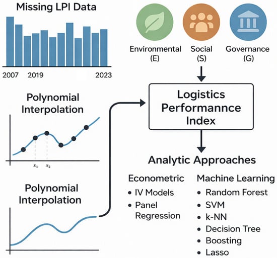 Overview of the Research Design and Analytical Framework. Note: the diagram illustrates the full research workflow, including the reconstruction of missing LPI values through polynomial interpolation, the integration of Environmental, Social, and Governance indicators, and the application of both econometric and machine learning approaches for the analysis.