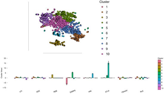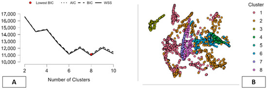 Figure 3 provides a summary of the model-based clustering outcomes with respect to both identifying the number of clusters and visualizing the data structure in the data space. Figure 3A illustrates the change in Akaike Information Criterion (AIC) and Bayesian Information Criterion (BIC) scores and Within-Cluster Sum of Squares (WSS) values with respect to the increase in the number of clusters. The red spot in the figure marks the point with the lowest BIC score; this indicates that the best compromise between data fit and model complexity is achieved with the model including eight clusters. This indicates that this number of factors provides sufficient information about the data structure pattern without sacrificing accuracy through overfitting or underfitting. The plot of the WSS indicates a gradual reduction in values until reaching the point corresponding to the medium number of clusters, beyond which the values vary, though in a smooth pattern. This pattern corresponds to data with a complex structure that cannot be adequately represented by a few clusters. Figure 3B provides information regarding the pattern of the eight clusters in the projected feature space. The clusters are well differentiated in this representation and express complex configurations in most cases. This color representation indicates that each component differs in predetermined regions of the data point space. This indicator also shows regions of differentiation in most components, with some appearing sparser than others. This provides information regarding the complexity of the patterns of various environmental and logistical factors represented through the model. The structure that emerges from this representation provides information on the effectiveness of the clustering analysis through the model’s grouping of profiles in conformity with the analysis’s objectives (Figure 3).