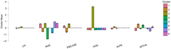 Standardized Variable Means Across the Eight Model-Based Clusters. Note: This figure displays the standardized means of key environmental and logistical variables across the eight clusters derived from the model-based clustering approach. LPI values show minimal variation across clusters, whereas environmental variables—particularly NOE, PM2.5AE, and HI35—exhibit strong differentiation. HI35 demonstrates the greatest discrimination, with one cluster showing notably elevated heat stress relative to others. ALPA and AFFVA present moderate variation among clusters. Overall, the figure highlights that cluster differentiation is primarily driven by environmental factors rather than LPI values.