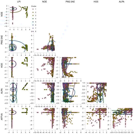 Pairwise Scatter Plot Matrix of Standardized Variables Across Eight Model-Based Clusters. Note: This figure presents a pairwise scatter plot matrix of six standardized variables across eight clusters derived from the model-based clustering analysis. Each subplot illustrates the bivariate relationship between variables, with colored ellipses representing the probabilistic distribution of each cluster component. The environmental variables—NOE, PM2.5AE, and HI35—demonstrate the strongest discriminatory power, producing distinct separations between high- and low-emission clusters. HI35 is the most influential factor, with one cluster exhibiting markedly elevated heat stress. In contrast, LPI shows minimal variation across clusters, clustering closely around the standardized mean and contributing little to group differentiation. Agricultural variables (ALPA and AFFVA) reveal moderate but less sharply defined patterns, suggesting subtle variations in land use and agricultural economic contribution. Overall, the matrix highlights that environmental factors predominantly drive cluster formation, whereas logistical performance indicators play a supplementary role within the broader ESG context.