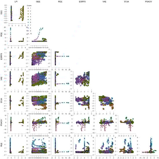 Figure 5 summarizes a pairwise scatter plot matrix of six standardized variables across eight clusters derived from a model-based clustering analysis. Each subplot presents the relationship between two variables using colored ellipses, noting the probability distribution of each component. The combined results indicate that environmental factors such as NOE, PM2.5 exposure levels, and HI35 are the key determinants in distinguishing the various clusters. Clusters are arranged in well-defined regions based on these factors, especially in the NOE and PM2.5 exposure level plots, where clear separations occur between high and low emission factors. However, the most significant determinant in this analysis is the HI35 variable, which shows one component with abnormally high levels of heat stress compared to other factors. Conversely, LPI shows minimal variation between factors and groups, yet remains clustered around the standard mean in terms of standardization. The result indicates that variations in logistical performance do not significantly account for the observed pattern in the data and supports the primary idea of relying on the environmental factors outlined in this analysis. The agricultural factors of ALPA and AFFVA provide more information, though they exhibit less-defined edges in the figure, suggesting minute variations in land use or in the overall economic role of agriculture. This analysis indicates that the figure presents a complex clustering pattern across multiple dimensions, in which environmental factors account for overall variation, except for LPI, which is significant yet supplementary in the overall context of Environmental Social Governance (Figure 5).