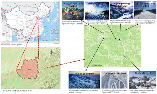 As one of the main competition venues for snow sports at the 2022 Winter Olympics, Chongli, Hebei, actively implemented the concept of green hosting. During the preparation for the Winter Olympics, the concept of green and low-carbon practices was integrated into the entire process of building and developing the Chongli Ski Tourism Resort. The Ski and Tourism Resort in Chongli, Hebei Province, is located in Chongli District, Zhangjiakou City, Hebei Province (Figure 1). It began in 1996 and has undergone 20 years of meticulous cultivation and dedicated development. Currently, it includes 169 ski runs totaling 161.7 km and 68 cable cars and aerial tramways totaling 45.6 km, forming the largest ice and snow tourism cluster in North China. The core area covers an area of 280 km2. The core area includes Wulan Ski Resort, Miyuan Yunding Park, Taowu Ski Resort, Changchengling Ski Resort, Fu Long Ski Resort, Duolameidi, and Cuiyunshan Galaxy Ski Resort. The total ski run area is 470 hectares, with a maximum daily capacity of 56,000 visitors. The vertical drop of the ski runs in the core area is 550 m.
