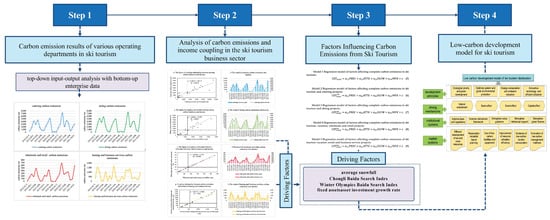 This study focuses on the ski tourism industry within the Chongli ski resort, employing key indicators such as tourist arrivals, tourism revenue, and energy consumption to conduct a computational analysis of operational data across four business sectors: skiing operations, catering services, rental businesses, and retail trade. This study innovatively applies input–output analysis to link micro-enterprises with regional economic structures, establishing a framework with which to measure carbon emissions for ski tourism. By conducting correlation analysis and single-indicator regression analysis, this study identifies potential influencing factors affecting overall ski tourism and its various operating departments, and also develops an econometric regression model. The ordinary least squares (OLS) method was used to estimate the direction and magnitude of the impacts of these factors on total carbon emissions in ski tourism and its subsectors. Based on these findings, this study examines the driving mechanisms underlying reductions in carbon emissions in the development of ski tourism resorts, while exploring foundational principles and concrete measures for advancing low-carbon development in the industry (Figure 2).