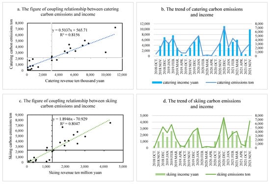 Coupling analysis of carbon emissions and revenue from catering: As shown in the figure below, the coupling curve between catering revenue and carbon emissions has an R2 value of 0.8156, with the majority of data points closely clustered around the fitted line, indicating a strong degree of coupling. Catering revenue explains 81.56% of the variation in carbon emissions from this sector, reflecting a significant positive correlation between revenue and emissions (Figure 4). It is expected that carbon emissions will continue to grow in tandem with increasing revenue in the foreseeable future. In general, during the months at the beginning and end of the snow season, carbon emissions are substantially higher compared to operating income, indicating elevated carbon emission intensity and reduced energy utilization efficiency during these periods. This pattern is closely related to the local climate characteristics of Chongli. Due to its high altitude and low temperatures, many catering enterprises resort to auxiliary heating methods outside the formal heating season to meet tourist demand, which disrupts the scale efficiency of energy supply and increases per-unit energy consumption.