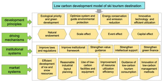 Based on the calculation and analysis of carbon emissions from ski tourism and various operating departments, it is clear that the overall carbon emissions from ski tourism in Chongli show cyclical fluctuations and are influenced by comprehensive factors such as natural conditions, the social environment, and the economic environment. Therefore, it is necessary to consider multiple aspects comprehensively to explore the construction of a low-carbon development model for ski tourism. The development of such a model in this study (Figure 5) includes four dimensions: development principles, driving mechanisms, institutional systems, and market systems.