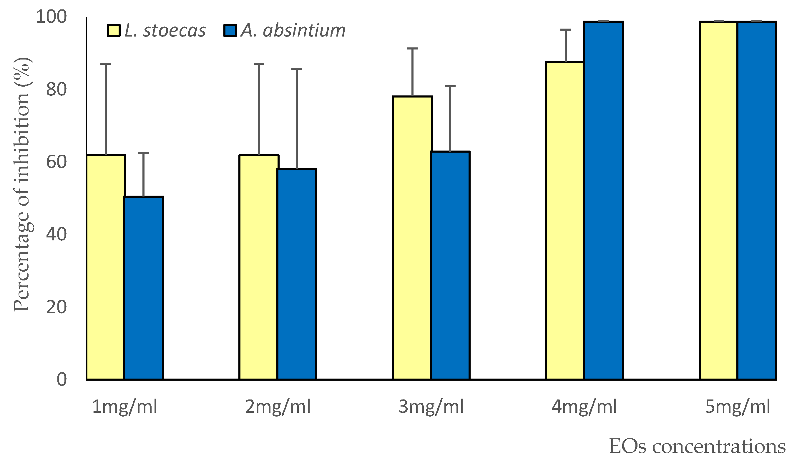 | Bacterial Strain | L. stoechas EO | A. absinthium EO |