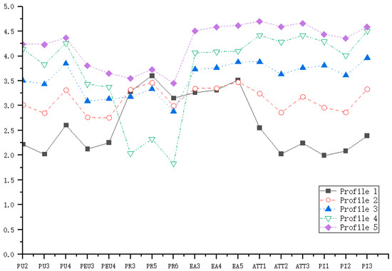 As shown in Table 4, when variables are divided into five profiles, Entropy has the maximum value. When divided into six profiles, the p value of LMR is not significant, indicating that the model with six profiles is not superior to that with five profiles. Therefore, this study determines five profiles as the optimal number. Figure 1 shows the scores of each profile on different manifest variables when divided into five profiles.