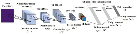 Convolutional Neural Networks (CNNs) employ convolution operations to extract features, offering both computational efficiency and robustness against interference. The architecture consists of five principal components: the data input layer, convolutional feature extraction layer, dimensionality reduction layer, fully connected classification layer, and output layer [34]. This study utilises a CNN derived from the classic LeNet-5 framework, enhanced with batch normalisation (BN) following convolutional layers and dropout after fully connected layers to mitigate overfitting, supplemented by an SE attention module after the second convolutional layer. As illustrated in Figure 2, the refined CNN architecture comprises an input layer, two convolutional layers (C1, C2), two pooling layers (P1, P2), an SE attention layer (S1), and three fully connected layers (F1, F2, F3). Informed by findings from reference [35] and LeNet-5′s parameter optimisation methodology, The parameter Settings of the CNN layer in this study are based on three criteria: First, referring to the classic framework of LeNet-5 in image feature extraction, combined with the feature density of the pump station vibration time-frequency graph (at a resolution of 256 × 256, the 5 × 5 convolution kernel can effectively capture local fault details such as the spatio-temporal distribution of impact pulses, and the 2 × 2 pooling can retain key time-frequency information while reducing dimension and avoid feature dilution); The second is the optimization rule of CNN parameters for fault signals of rotating machinery. Six initial convolution kernels can cover the harmonic features of low-order faults, and 16 deep convolution kernels can further extract the features of high-order coupled faults (such as the composite frequency components of misalignment—friction coupling faults). Thirdly, through comparative experiments (testing 3 × 3/7 × 7 convolution kernels and 1 × 1/3 × 3 pooling kernels), the current parameters perform the best in terms of model convergence speed and fault classification accuracy. Moreover, after the SE attention layer is set at the C2 layer, channel weighting can be carried out for complex features extracted from deep layers to enhance the focus on fault-sensitive channels, Table 1 presents the definitive network configuration. The system processes 256 × 256 × 3 dimensional time-frequency images as input, yielding 7 × 1 dimensional outputs. The C1 layer’s 6 convolutional kernels produce 256 × 256 × 6 feature maps, downsampled to 128 × 128 × 6 by P1. C2′s 16 kernels generate 128 × 128 × 16 features, subsequently reduced to 64 × 64 × 16 through P2 pooling.