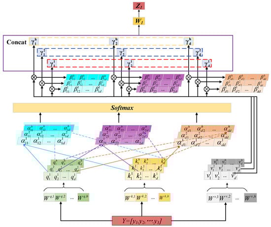 Assuming a set of input sequences , according to Figure 3, we can first derive the query vector , key vector , value vector , and the linear transformations matrices , , for query, key and value of the i-th head.