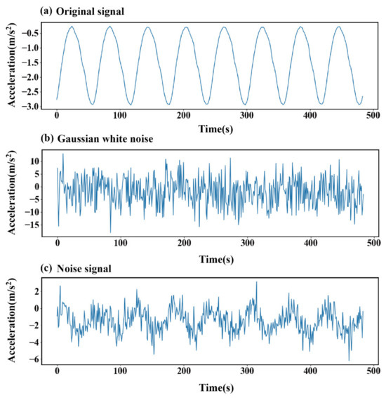 Figure 8 shows a set of original experimental fault signals, Gaussian white noise signals, and fault signal graphs containing Gaussian white noise: Figure 8a shows the original signal, which is derived from the vibration signal collected by the three-axis vibration acceleration sensor at the drive end bearing housing of the pump station unit test bench under normal no-load operation conditions without preset faults. The core components are the fundamental frequency harmonics of the motor and the low-order harmonics of the bearing. The harmonic characteristics of slight interference formed after superimposing the slight vibration of the test bench base and the background noise of the circuit, and this signal has a non-zero average value phenomenon. It is mainly caused by the mechanical static offset caused by the preload force of the test bench bearing and the shafting assembly, as well as the low-frequency zero drift of the sensor and the DC component introduced by the offset of the front-end circuit of the acquisition card. However, this non-zero average value belongs to the static baseline offset. It is independent of the dynamic fault characteristics. The subsequent CWT time-frequency conversion can be effectively separated without interfering with the model performance. Figure 8b shows the Gaussian white noise signal, which is the noise source for the subsequent construction of the noisy sample. Figure 8c shows the fault signal containing Gaussian white noise, which is generated by superimposing the original fault signal in Figure 8a and the Gaussian white noise in Figure 8b in a specific proportion. This paper tests the fault diagnosis method based on the CTT-MHA-CNN model for such noisy fault signals with a signal-to-noise ratio of −8 to 8 dB.
