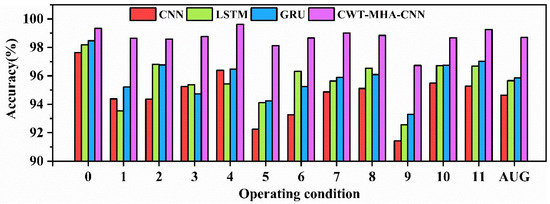 Firstly, experiments were conducted on the raw data of pump station units, and the diagnostic accuracy of different models is shown in Table 3, where “AVG” represents the average accuracy. Figure 10 shows the bar charts of diagnostic results for different models.