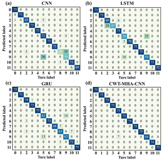 Through the visualization of t-SNE dimensionality reduction, it can be seen that the CWT-MHA-CNN model has a more compact intraclass clustering and a more distinct interclass distribution compared to the CNN model, LSTM model, and GRU model. All four models can better identify other working conditions, except for working conditions 5 and 9. However, there is some overlap in identifying events in working conditions 5 and 9, and the effect is not significant compared to other working conditions. This is consistent with the results of the confusion matrix in Figure 11. Based on the qualitative analysis of the above visualization, this article also selected the interclass distance based on data labels for quantitative evaluation, as shown in Table 4. Standardized Mutual Information (NMI), as an external indicator for evaluating clustering performance, is used to measure the degree of conformity between clustered data labels and real labels. The closer its value is to 1, the better the clustering effect. The NMI index of the CWT-MHA-CNN model is 0.92, and the Davidson Boding index (DBI) is an internal indicator for evaluating clustering performance. A smaller value indicates higher clustering effectiveness and lower dispersion. The DBI value of the CWT-MHA-CNN model is 0.04; the closer the silhouette coefficient (SIL) approaches 1, the better the cohesion and separation. The SIL value of the CWT-MHA-CNN model is 0.917. Overall, the CWT-MHA-CNN proposed in this article outperforms other models in terms of performance.