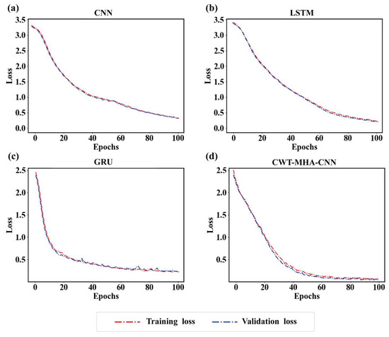 While the loss on the training set decreased gradually, the loss on the validation set increased, suggesting that the model may have a slight overfitting phenomenon. In contrast, the loss curve of the CWT-MHA-CNN model is relatively smooth, and there is no obvious bump, which indicates that this model is better than the other four models in terms of performance.