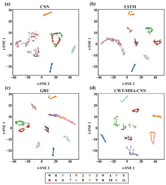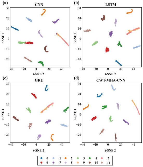 Feature distribution maps of different models. ((a) is the t-SNE graph of the CNN model, (b) is the t-SNE graph of the LSTM model, (c) is the t-SNE graph of the GRU model, and (d) is the t-SNE graph of the CWT-MHA-CNN model).
