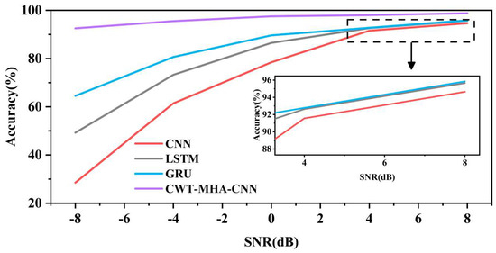 In order to explore the noise resistance performance of the CWT-MHA-CNN model proposed in this article, training tests were conducted using noisy fault sample signals constructed in Section 3.2, ranging from −8 dB to 8 dB. The diagnostic results were then compared with those of the CNN model, the LSTM model, and the GRU model. For each model, the average result of 10 experiments was used as the evaluation criterion, and the specific results are shown in Table 5. Figure 14 shows the trend of accuracy changes better in line graphs with different model accuracies.
