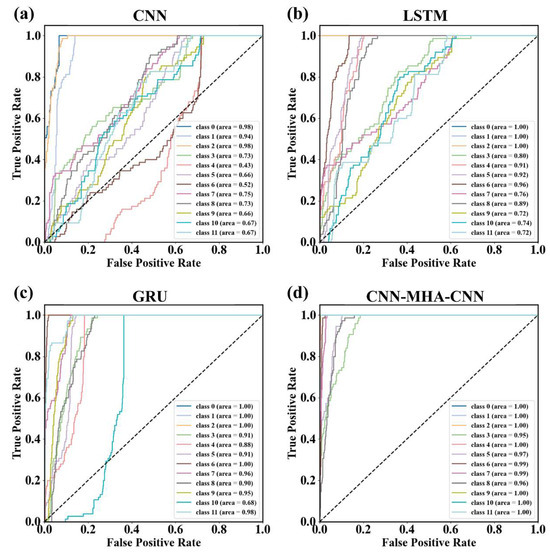 ROC curves of different models. ((a) is the ROC plot of the CNN model, (b) is the ROC plot of the LSTM model, (c) is the ROC plot of the GRU model, and (d) is the ROC plot of the CWT-MHA-CNN model).