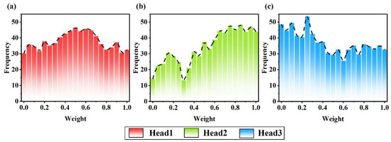 To verify the attention mechanism of MHA in processing variance information, we input faulty sample data into MHA and extracted the weights of the sample information. Figure 19 shows the weight distribution histograms of Head1, Head2, and Head3. Observing Figure 19, we found that the weight distribution of Head1 exhibits a normal distribution, which reflects its upward and downward role in task processing. It receives information from the early stages and provides effective feature representations for task processing in the later stages, so it needs to focus more on fine processing and analysis of information in the middle stage. Head2 allocates relatively small weights in the early stages of training but gradually increases in the later stages, reflecting the model’s handling of input information diversity in the adaptation stage. As the training progresses, the model gradually learns to filter out feature information that is more critical to the task from the input and increases its attention to this information, resulting in an increase in attention weights in the later stage. In contrast, Head3 is assigned a larger weight in the early stages, indicating that Head1 focuses more on the feature information that contributes significantly to the task in the early stages of training, playing a crucial role in the model’s understanding and prediction in the initial stage.