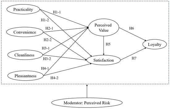 With the technology acceptance and adoption in the present era, the importance of risk perception is evident when dealing with technology and online transaction [11]. As such, consumers’ perception of risk could influence their cognition of the selection attributes and, subsequently, impact on their level of satisfaction or loyalty to the unmanned stores [49]. Thus, in a high-risk situation, consumers will be more prone to evaluate the attributes provided by unmanned stores and the better these attributes perform, their concern of risk would be eliminated, and consumers could tend to be more satisfied. On the contrary, when they perceive the low level of risk, their perception of value, satisfaction, and loyalty could be less impacted by the attributes provided by unmanned stores. Thus, the following hypothesis could be postulated. Collectively, the research framework was established based on the above discussion, and it is indicated in Figure 1.