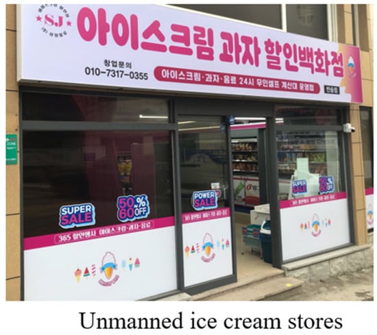 The unmanned stores investigated in this research concentrate on four typical types of unmanned stores which are the unmanned ice cream shops, unmanned printer stores, unmanned laundries, and unmanned ramen shops in Republic of Korea, because based on the data provided by Statistics Korea, these four types of unmanned stores are the most common and popular unmanned stores in the South Korean market. Meanwhile, these stores share similar characteristics of compact space (for each store of 20 Pyeong, approximately 66 square meters), low investment threshold, and the absence of manual supervision during daily operations, reflecting features of high automation and cost optimization. Figure 2 indicates the examples of Korean unmanned stores.