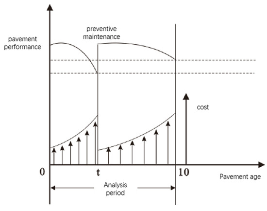 In China, the Ministry of Transportation and Communications of China’s Measures for Economic Evaluation of Highway Construction Projects stipulates a 20-year period for analysis. Given the country’s rapid economic and technological development, the societal changes and the long-term benefits of early maintenance interventions need to be accounted for. To adapt to these dynamic factors and ensure a realistic assessment, this article adopts a 10-year life cycle analysis period, which better reflects the current pace of development while accommodating the long-term benefits of timely highway maintenance.