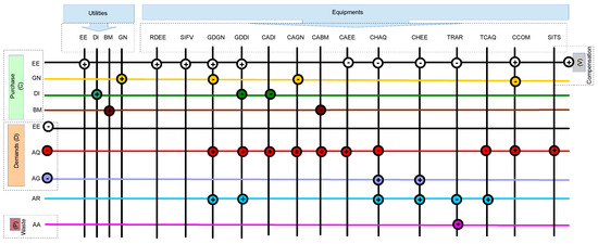 The superstructure includes all possible technologies, available energy resources, and their interactions. Equipment is included in the superstructure based on the energy demands of the residential building, considering commercially available technologies. Figure 1 illustrates the superstructure considered herein. A positive node indicates energy production (supply), and a negative node indicates consumption. Horizontal lines refer to physical distribution systems into which the equipment (the vertical lines) can supply or consume.