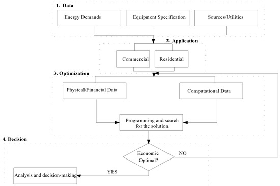The flowchart in Figure 2 presents the required steps and the sequence of the modeling of the multigeneration system, as well as the requirements for programming and optimization.