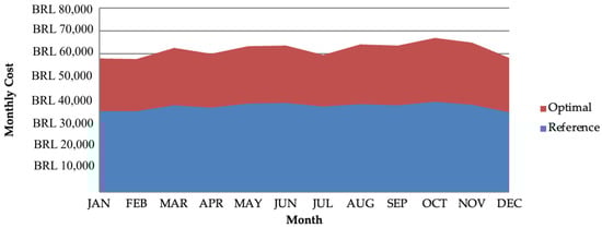 Considering that the overarching aim of the program was to provide flexibility and ease of use, the optimization model can also provide other information. It is possible to visualize the hourly and monthly operation of the system (which equipment operates, the consumption of utilities, O&M costs, etc.). The graph in Figure 3 presents the monthly costs associated with the purchase of utilities throughout one year for the reference and optimal systems of the residential building.