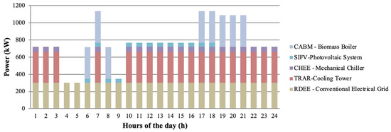 Comparing our results with those of Melo et al. [31], who did not consider renewable resources, it is observed that including commercially available equipment that uses renewable resources is interesting from an economic point of view. In [31], only traditional electrical equipment was installed, and herein the biomass hot water boiler and solar PV panels were installed to achieve an economic optimal solution. The system implemented by Melo et al. [31] did not allow new equipment and utilities to be inserted flexibly and dynamically.
