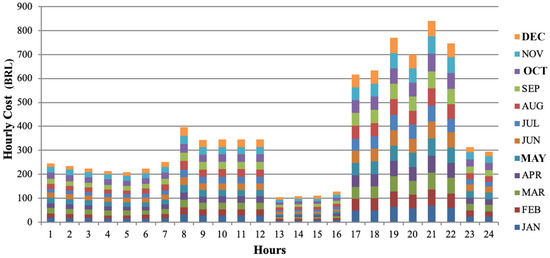 The graph in Figure 5 shows that from 5 p.m. to 10 p.m., the hourly cost of equipment and utilities is higher, coinciding with the peak of demand and the absence of PV solar energy generation after 6 p.m.