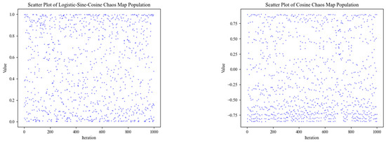 (1) N population individuals are generated according to the Logistic-Sine-Cosine chaotic mapping method, each with dimension D. The two-dimensional individual expression mapped using Equation (24) is as follows: