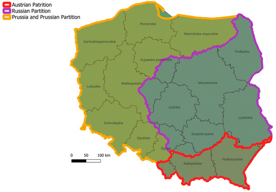 - Buszko, J. History of Poland 1864-1948 (Historia Polski 1864–1948); Państwowe Wydawnictwo Naukowe: Warsaw, Poland, 1987. [Google Scholar]