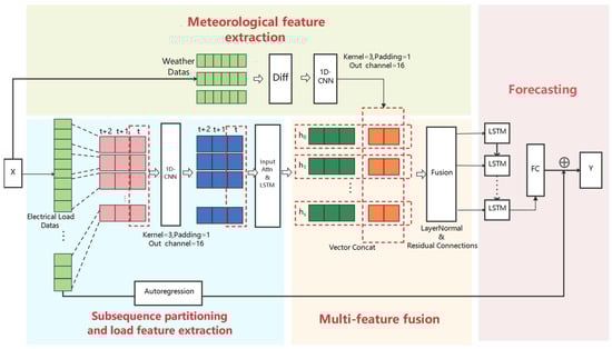 A multifactor fusion sub-network is developed, utilizing residual connections and layer normalization to align and integrate electric load and meteorological features, enhancing model performance.