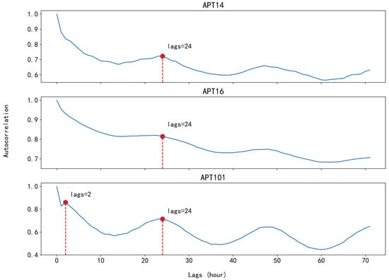for data uncertainty special extraction, it is obvious that the value is related to the periodic characteristic of electricity use by users, and it is easy to think that 24 h is an applicable length. In order to further study the periodic characteristic, we studied the relationship between the lagging and autocorrelation coefficients of three users in 0–72 h; the peak point in the figure is the periodic relationship in the load. As shown in