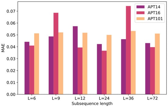 The results from multiple experiments indicate that among the three users, the model performs best when the subsequence length is set to 24, making this choice for the optimal subsequence length reasonable. Compared to the unsegmented sequence length = 72, the model with subsequence partitioning provides better predictive performance, demonstrating the model’s sensitivity to subsequence length. An inappropriate subsequence length adversely affects the model’s ability to process user power load information. Notably, for APT14, subsequence lengths of 12 and 36 yielded poor performance, which aligns with the information provided by the autocorrelation plot. For APT16, the model performs poorly at subsequence lengths of 9 and 36. Cross-referencing with the autocorrelation coefficients shows that APT16 lacks significant periodicity within a 24 h interval, with a trough at 36 h, indicating that when subsequence partitioning does not match user periodicity, the model’s inference ability decreases. A similar conclusion can be drawn for APT101, though due to the presence of a minimum cycle of 2, the model’s error range remains relatively stable across different subsequence lengths for this user.