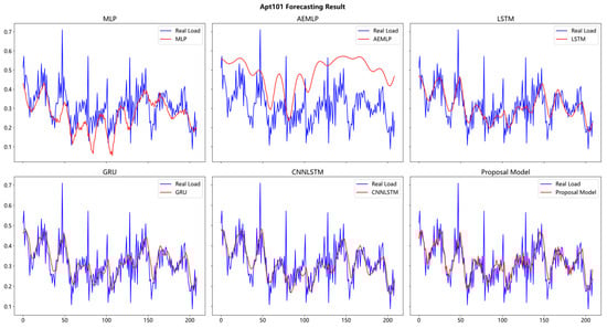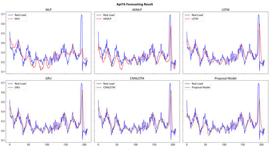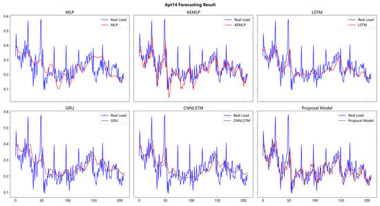 The prediction errors of the model proposed in this paper for the three users of numbers APT14, APT16, and APT101 are as follows: MAE: 4.23 × 10−2, 3.67 × 10−2, 5.00 × 10−2; MSE: 3.46 × 10−3, 3.77 × 10−3, 4.95 × 10−3; RMSE: 5.88 × 10−2, 6.14 × 10−2, 7.04 × 10−2. Compared to the five comparison models such as MLP and LSTM, our model error is optimal on all three error evaluation metrics. The forecasting results for the three users showed that direct forecasting using the fully connected MLP model was poor and the least effective of all the forecasting models; however, the results also showed that the MLP model could make predictions of upward and downward trends. The improvement in all three error indicators over direct regression using the MLP demonstrates the validity of the analysis of one indicator series by multiple fully connected networks followed by data fusion, which informs our approach to constructing external factor inputs to the data fusion. However, AEMLP is prone to overfitting, while the model has a large number of hyperparameters that make it difficult to train and debug, providing a challenge to use the model for load forecasting. Comparing the added CNN with the traditional LSTM model, the CNNLSTM model is not effective in improving the model prediction performance compared to the LSTM. Local features extracted using CNN convolution in sequences with multiple different metrics still require further processing of the local features. Our proposed model employs an input attention scheme for multiple sequences of local features extracted by the CNN, giving each feature a different weight through input attention, which works well in subsequent prediction tasks.