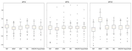 By comparing the 24 h prediction error statistics of all models, the prediction stability of our proposed model is better in APT14 and APT16 users, while in APT101, the error of LSTM performs the most stable most of the time.