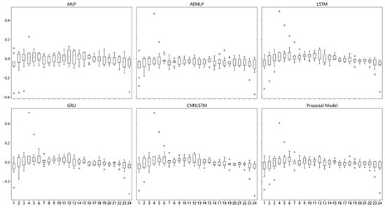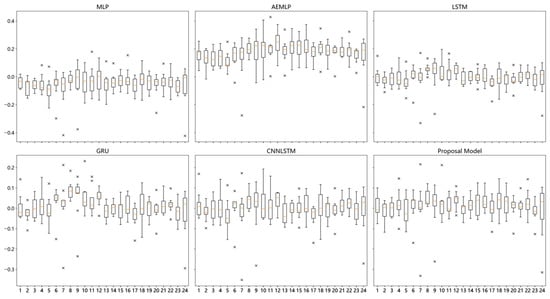 Figure 13 present an analysis of the MAE in 24 h predictions for each of the three users. For user APT14, our proposed model shows relatively stable error levels between 13:00 and 21:00. In the case of user APT16, all models exhibit higher error rates in the first 12 h, followed by a more stable error pattern in the latter 12 h. For user APT101, the proposed model demonstrates more pronounced fluctuations in prediction error throughout the 24 h period.