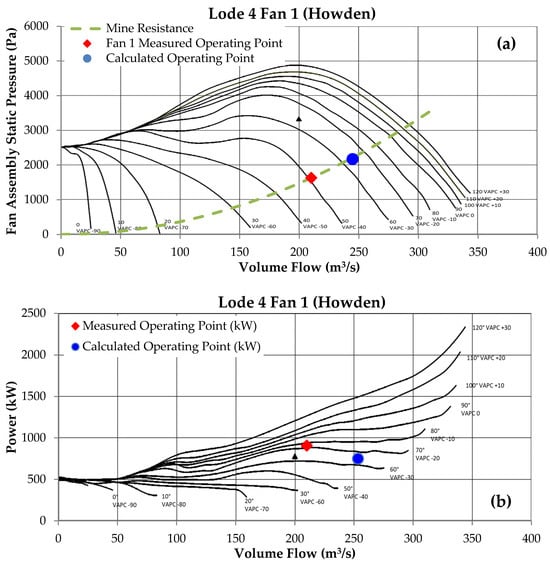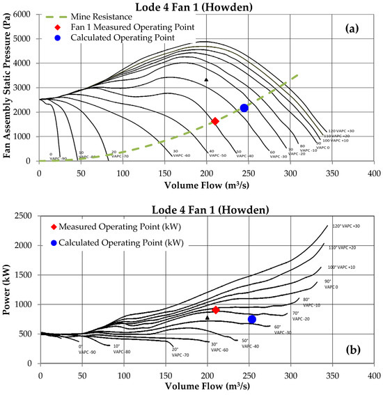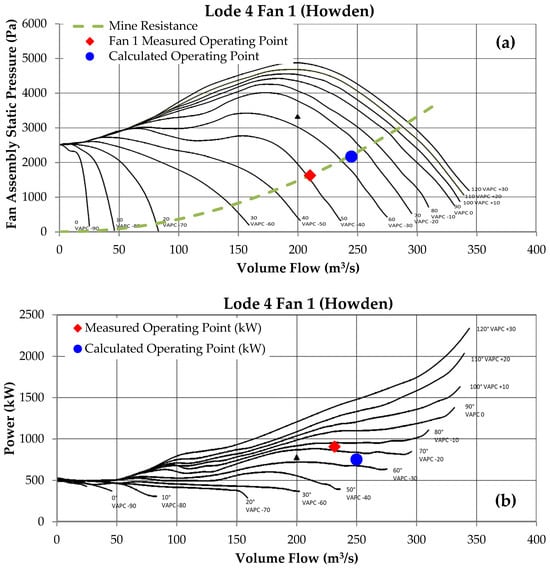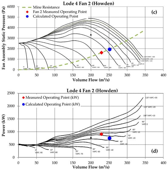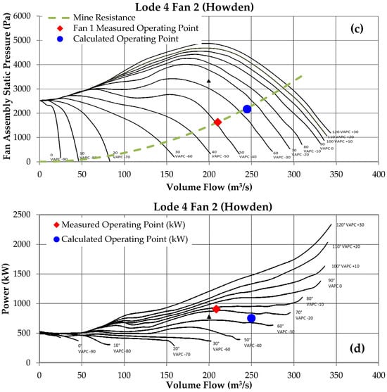 Figure 6, Figure 7, Figure 8 and Figure 9 present fan assembly curves for the lode fan, which represents the relationship between fan assembly static pressure (Pa) and volume flow (m3/s) in March, June, September, and December in 2023, respectively. The mine resistance curve represents the resistance of the mine’s ventilation system. As volume flow increases, the resistance to airflow also increases, following a parabolic curve. Fan performance curves are illustrated for different settings of the VAPC (variable air pressure control), with values ranging from VAPC −90 to VAPC +30. These curves show the relationship between static pressure and volume flow at various VAPC settings. “Fan measured operating point” represents the actual measured operating point of a specific fan, showing where it operates in terms of both static pressure and airflow. “Calculated operating point” marks the calculated operating point, which has been determined through some optimization or modeling process. The chart visually compares the measured and calculated operating points against the expected performance of the fan, considering the mine’s resistance and the fan’s capabilities at different VAPC settings. This information helps in analyzing the fan’s efficiency and determining whether the current setup meets the mine’s ventilation needs efficiently.