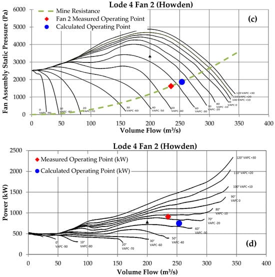 Fan assembly curve in Lode4: (a) static pressure in Fan1, (b) power in Fan1, (c) static pressure in Fan2, and (d) power in Fan2 regarding the evaluation in March.