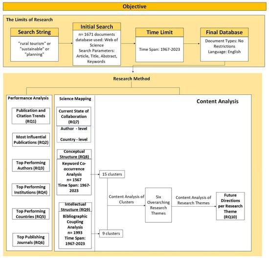 The structure of this paper is as follows: Section 2 presents our research methodology, offering a detailed explanation of the bibliometric approach applied to analyze and map rural tourism. Section 3 provides a performance analysis, examining key aspects of rural tourism research, including articles, authors, institutions, countries, and journals. Section 4 investigates the relationships and collaboration dynamics in rural tourism by mapping co-authorship networks at both author and country levels. Section 5 focuses on keyword co-occurrence analysis to identify the conceptual network within rural tourism. This section carefully maps thematic structures, emphasizing the interconnectedness of keywords and their significance in shaping the field’s core topics. Section 6 uses bibliometric coupling to analyze the intellectual structure of rural tourism, clustering articles based on shared references to highlight intellectual connections and key themes. Section 7 introduces emerging research themes, providing insights into their unique characteristics, historical context, and alignment with specific applications in rural tourism. Section 8 explores future research directions, identifying under-researched areas and current challenges. Finally, Section 9 concludes the study by synthesizing key findings from bibliometric analysis and discussing broader implications for scholars, policymakers, and industry professionals. This section also highlights the research’s contributions to potential future avenues for investigation and acknowledges its limitations.